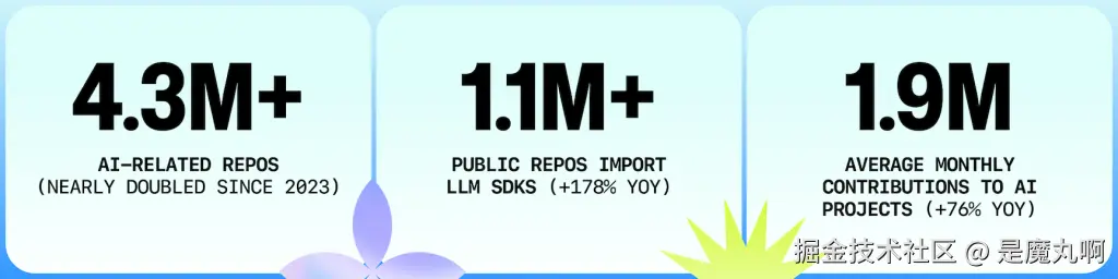 三年前,我们说 AI 不会取代开发者------它会将更多人带入生态系统。数据现在证明了这一点:GitHub 上的活动达到创纪录水平,有更多贡献者、更多仓库和比以往更多的实验。