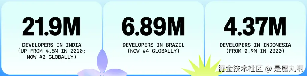 - 仅印度今年新增的开发者数量超过任何其他国家,增长速度超过美国。