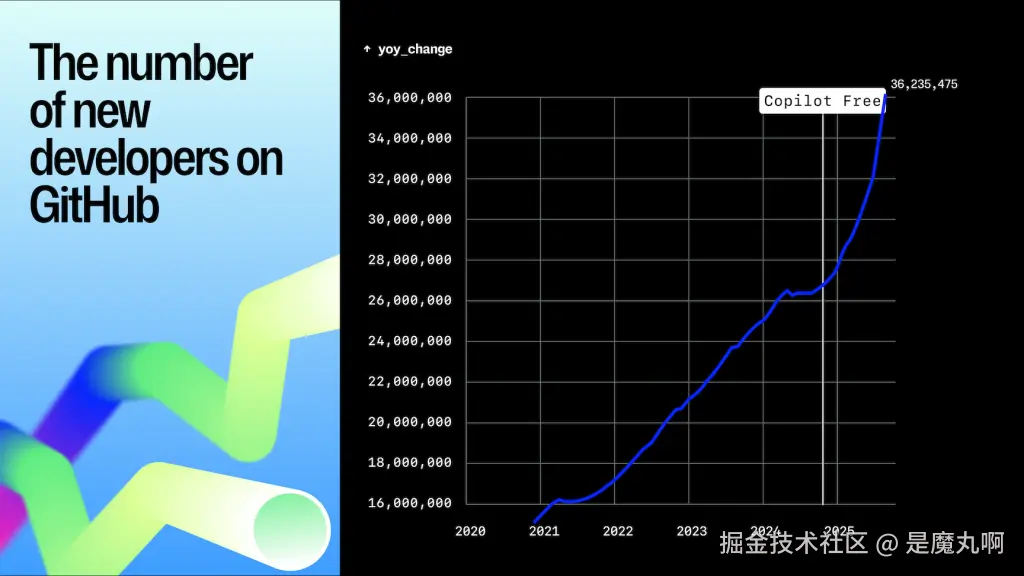 如果 2025 年有一个主题,那就是增长。平均每秒有超过一个新开发者加入 GitHub------仅过去一年就超过 3600 万。这是我们迄今为止最快的绝对增长率,现在有 1.8 亿多开发者在 GitHub 上工作和构建。