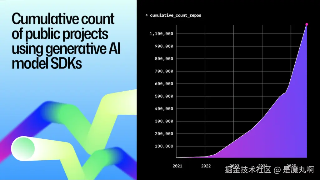 113 万+公共仓库现在依赖生成式 AI SDK(同比增长 178%)。超过 693k+ 在过去 12 个月内创建,明显超过 2024 年的总数(约 40 万)。始于 2023 年初的复合曲线显示没有减弱的迹象;平均每周,我们仍然看到新的历史最高点。