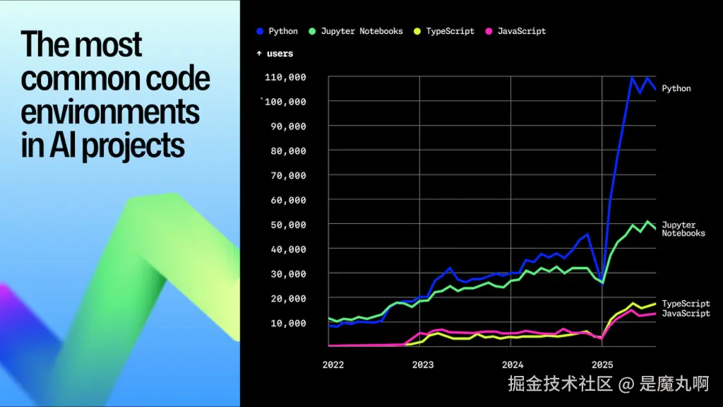 Notebooks 现在是成熟的实验工具,而 Dockerfiles 被视为通往可重现性和生产的桥梁 。2025 年,240 万仓库使用 Notebooks(同比增长 75%) ,190 万使用 Dockerfiles(同比增长 120%)。这种增长可能源于对代理和 LLM 进行沙盒化的需求,而容器化是安全运行和扩展它们的实用方法。