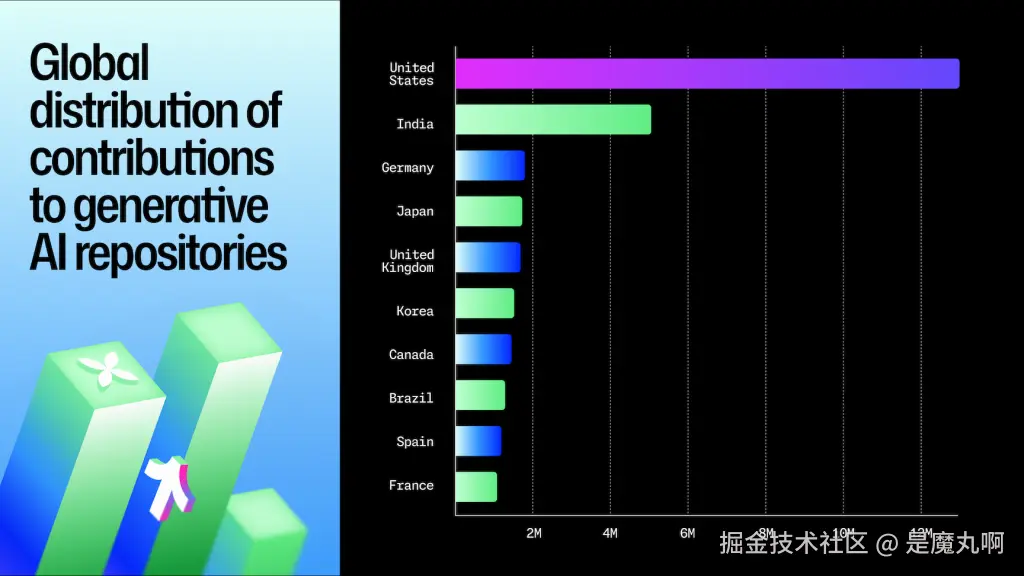 - AI 热潮是全球性的:GitHub 上生成式 AI 项目的贡献者数量持续快速增长,这些贡献者遍布世界各地。