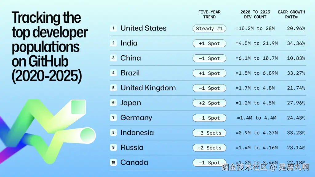 从过去五年(2020 年到 2025 年),印度、巴西和印度尼西亚的平台上的开发者数量增加了两倍多;日本和德国的开发者数量增加了两倍多;美国、英国和加拿大的平台上的开发者数量增加了一倍多。