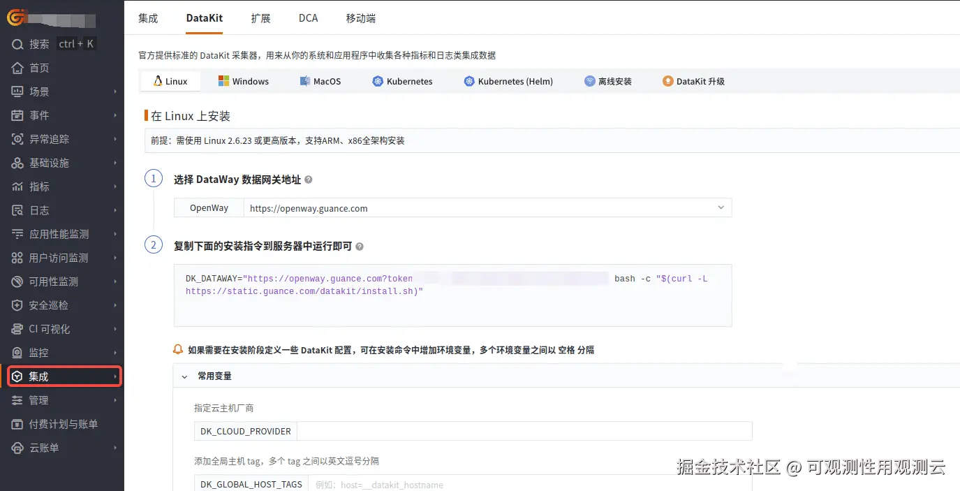 登录观测云控制台,在「集成」 - 「DataKit」选择对应安装方式,当前采用 Linux 主机部署 DataKit。