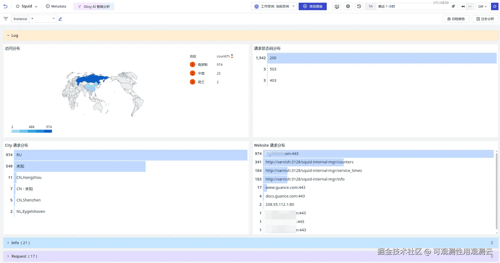 Squid 监控通过采集 cache.log / access.log、squid-exporter Prometheus 指标 及 10 分钟滚动命中率 、DNS 查询量 等实时数据,统一接入观测云,实现命中率、流量、错误、FD/内存/磁盘资源的多维可视化和告警,让用户一眼看清缓存效率与系统瓶颈。