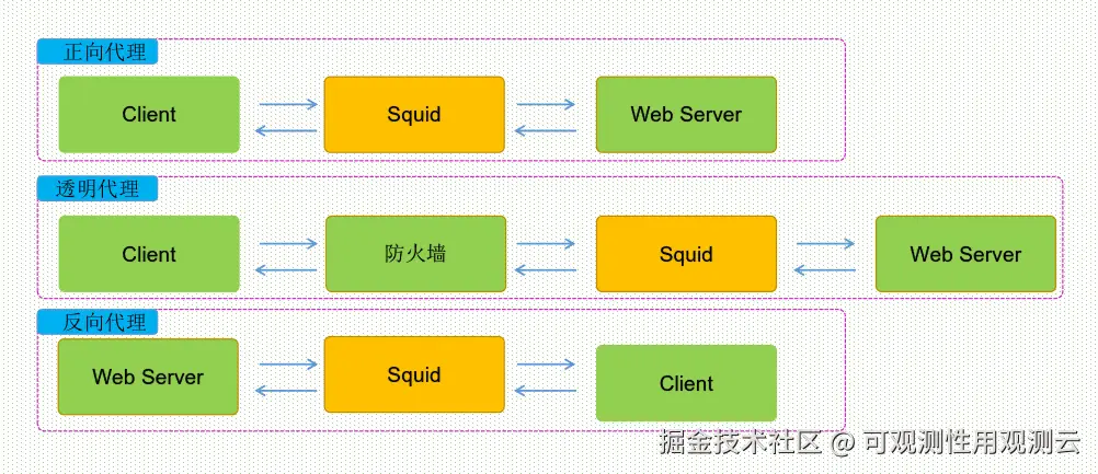 | 透明代理 (Transparent Proxy) | Client → 防火墙/网关 → Squid → Web Server网关无感知重定向流量,客户端零配置。 | 网络的中间人强制流量经过代理,对用户透明。 | • 网关级缓存 • 策略过滤 • 带宽节省 • 行为管理 |