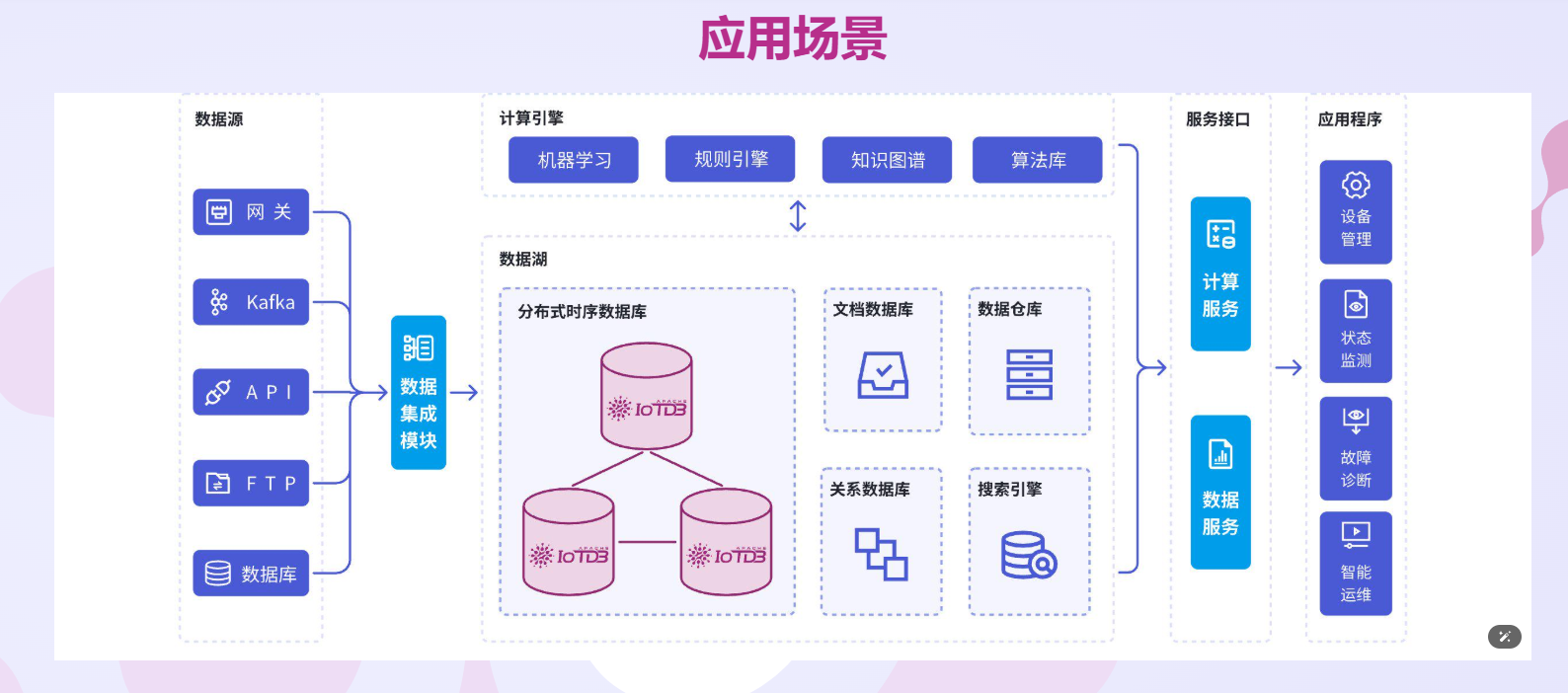 在实际应用中,IoTDB已被广泛用于工业物联网、能源管理和车辆监控等领域。例如,在一个典型的大数据管道中,Kafka采集实时数据,IoTDB存储并分析,Grafana可视化输出,实现闭环。