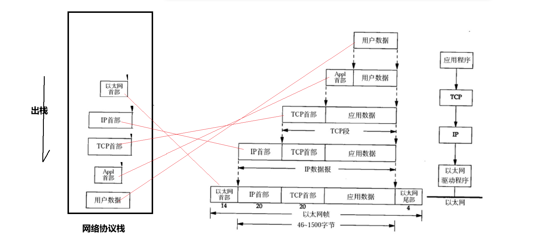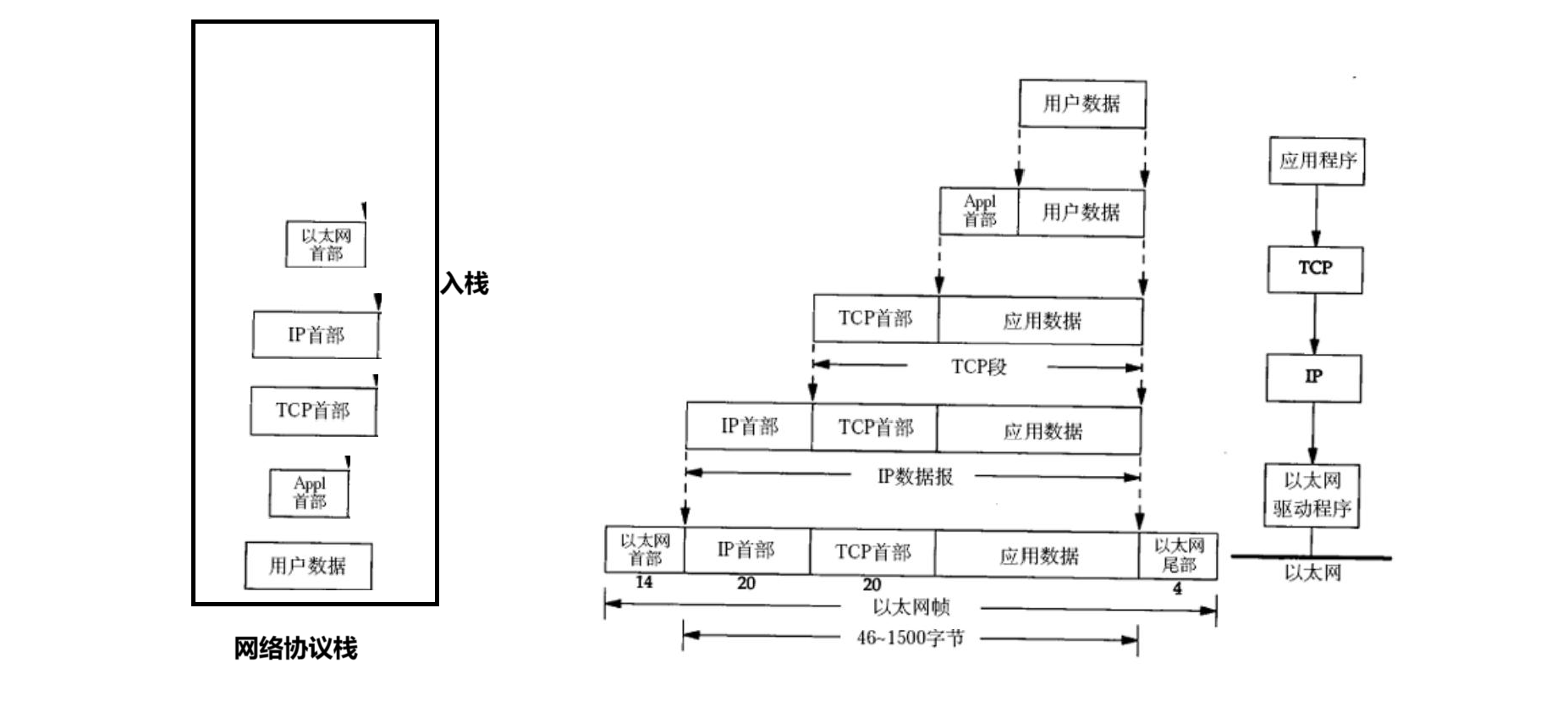 应用层数据通过协议栈发到网络上时,每层协议都要加上一个数据首部(header),称为封装(Encapsulation).首部信息中包含了一些类似于首部有多长, 载荷(payload)有多长, 上层协议是什么等信息.数据封装成帧后发到传输介质上,到达目的主机后每层协议再剥掉相应的首部,根据首部中的 "上层协议字段" 将数据交给对应的上层协议处理