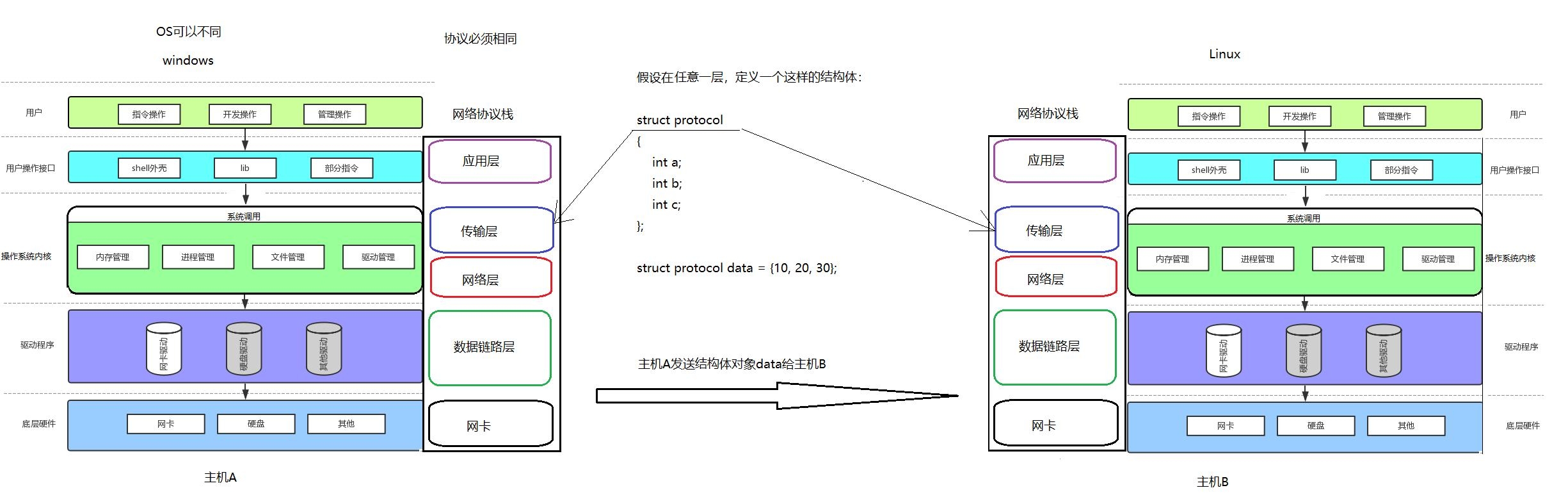 我们左手有了协议,右手有了协议要分层的概念。而其中每层都有协议, 所以当我进行进行上述传输流程的时候, 要进行封装和解包。而协议本质上就是结构体。所以如果主机A给主机B发送数据,每一层都会有协议,也就会多一些字段,而根据OS系统的层状结构,TCP/IP协议和OS系统的关系,数据一定会贯穿整个协议栈!如图: