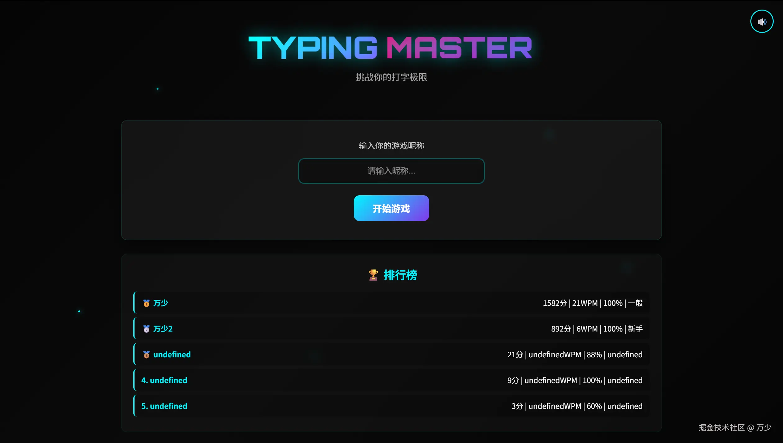 1.JSON我想要生成一个 pc端的web的打字游戏网站 - 使用html+css+js来实现 - 功能包括有,输入玩家姓名、记录分数 - 游戏界面要求炫酷,可玩性高 -