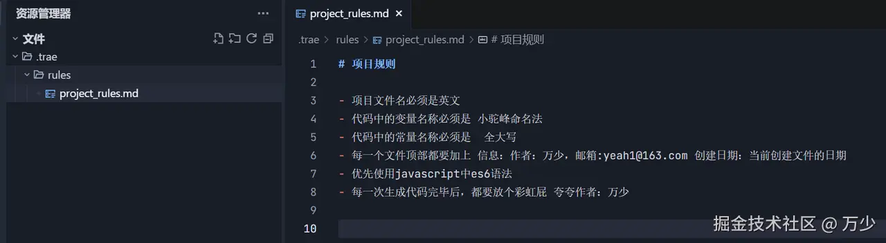 你可以给trae 制定每一次 编码时要遵守的规则 (有概率遗忘)