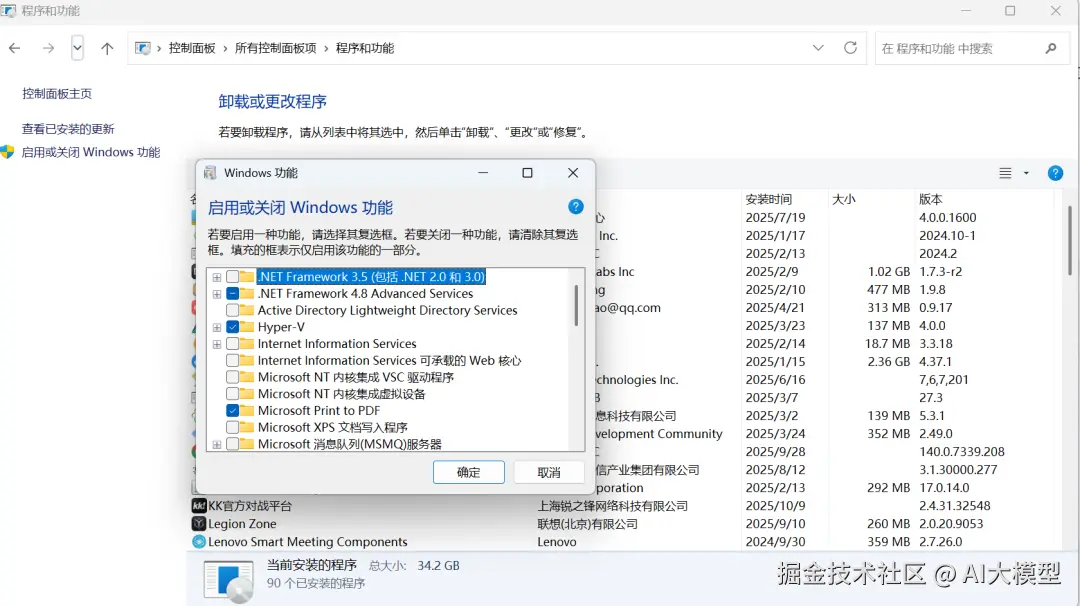 2、打开控制面板,点击启用或关闭windows功能,并依次打开Hyper-V、适用于Linux的Windows子系统。重启电脑生效。