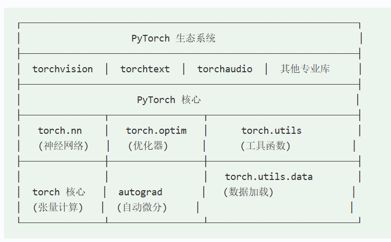pytorch的架构图如上,其核心操作有torch.nn神经网络,torch.optim优化器,torch.utils工具函数,torch核心,autograd自动微分,torch.utils.data数据加载。