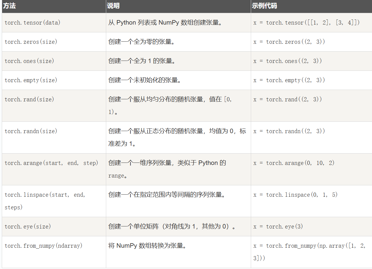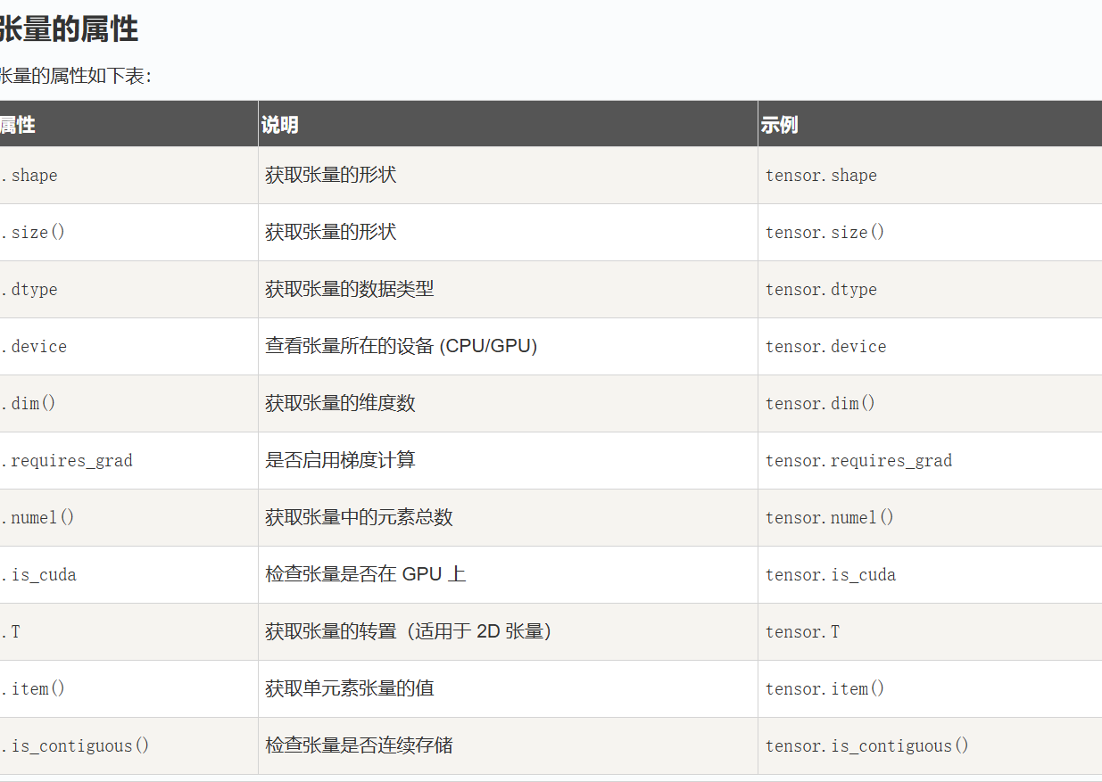 张量的属性如下表。常用的有tensor.shape获取张量的形状,tensor.size()获取张量的形状,tensor.dtype获取张量的数据类型,torch.device查看张量所存在的设备。
