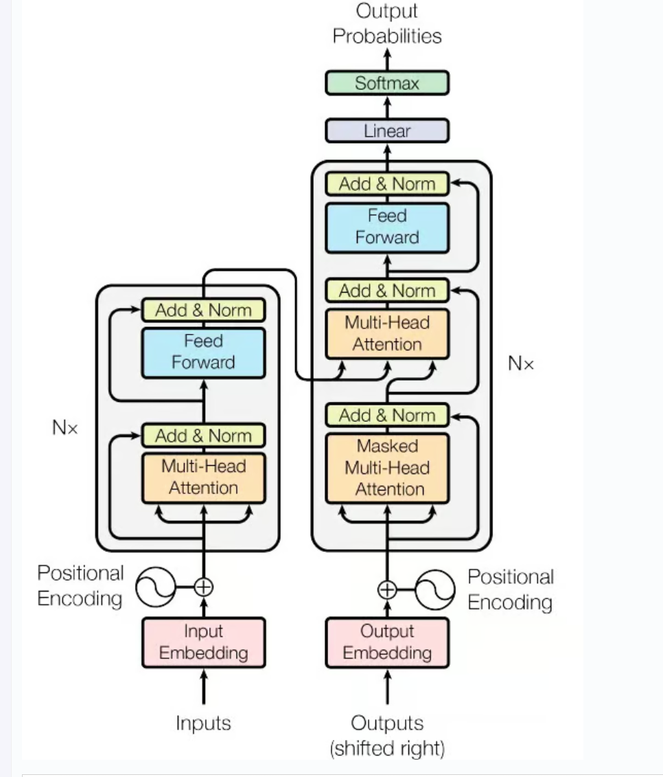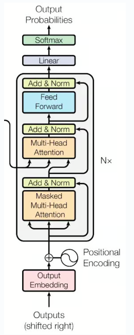 解码器比编码器要更加复杂一些,其包含一个自注意力层,一个交叉注意力层和一个前馈网络和若干个连接归一层。最后还用了softmax函数把结果输出为0-1之间的概率。编码器与解码器的区别还在于解码器实际上是一个循环推理的过程,正如循环神经网络一样。简单的理解来说,编码器仅仅做一个encoding,而解码器需要每次预测下一位的token。也就是为何解码器既有输入的output embedding而且还是右移一味的 ,还有一个输出output probabilities指向0-1概率。