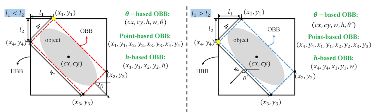 其中(x, y)为框中心坐标,w、h为宽高,θ为旋转角(通常取 -90°~90° 或 0°~180°)。 - 四顶点坐标法 (x1, y1, x2, y2, x3, y3, x4, y4) :