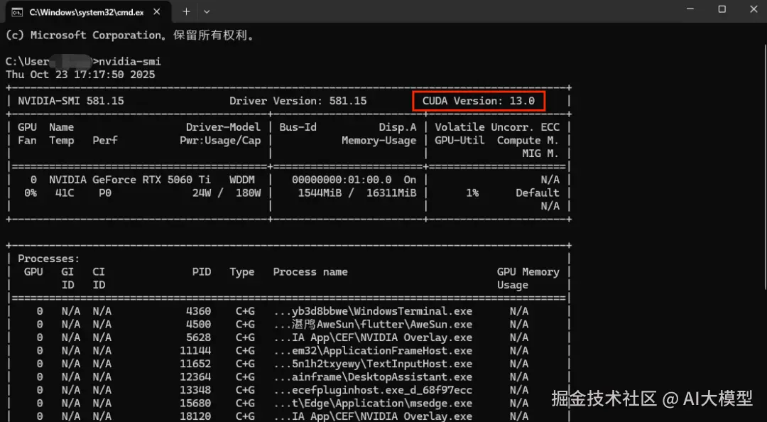 (1)CMD下输入 nvidia-smi,查看显卡支持最高的cuda版本,此电脑最高可安装13.0,考虑到很多项目可能不支持最新版的cuda,这里选择cuda为12.9。