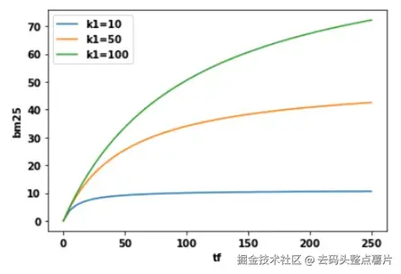 BM25 通过引入参数 k1 来控制这种"饱和曲线"的形状。