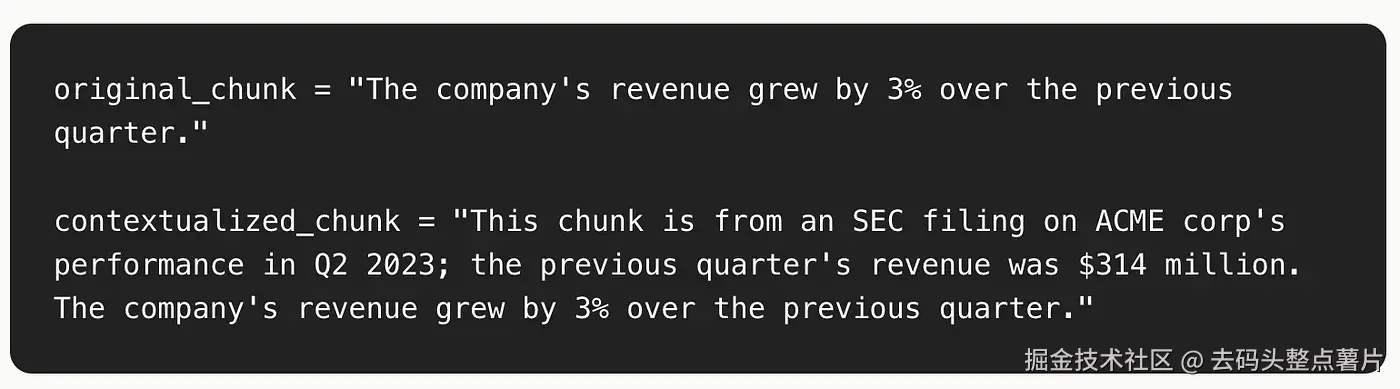 通过将整篇文档和每个片段一并发送给 LLM,我们可以得到一个"上下文化的片段(contextualized_chunk) ",例如: