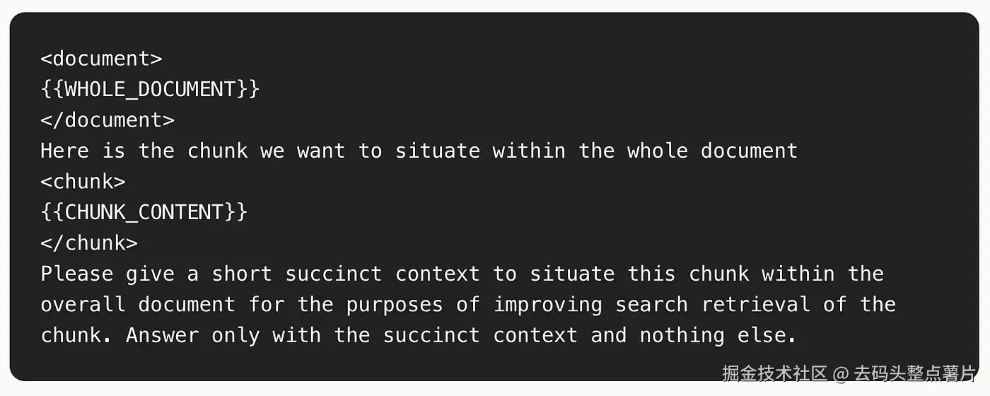你可以利用 大语言模型(LLM)来实现上下文检索。具体做法是:为 LLM 设计一个提示词(prompt),让模型基于整篇文档,为每个片段生成简洁的、与该片段相关的上下文信息,从而为每个片段补充必要的语境。