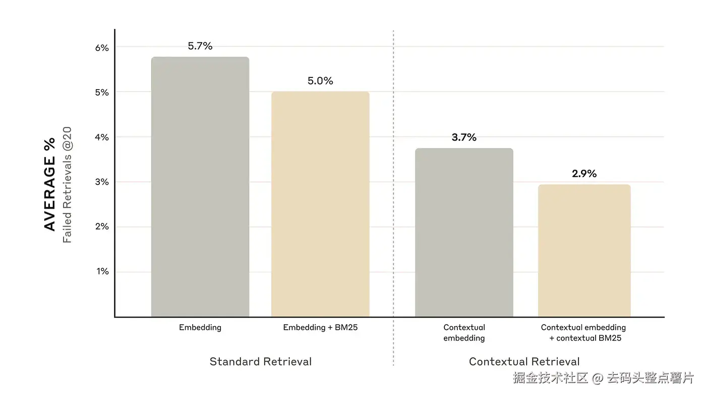 Anthropic 的实验表明,将 上下文嵌入(Contextual Embeddings) 与 上下文 BM25(Contextual BM25) 结合后,