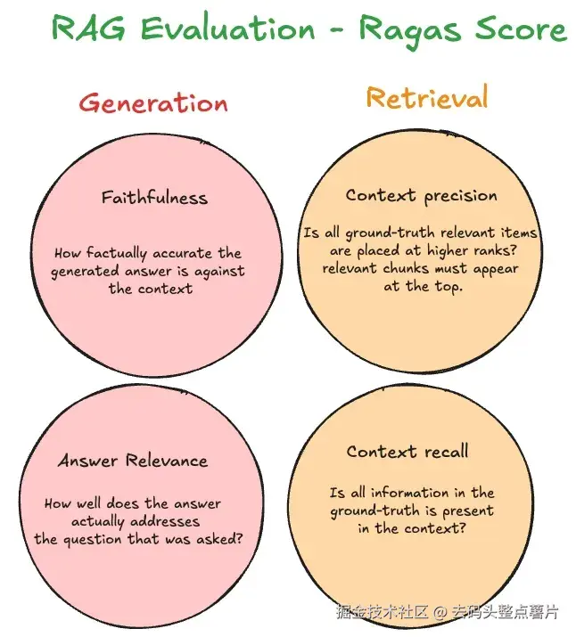 Ragas 是一个帮助你评估 RAG 流程效果的框架。其中两个指标(Faithfulness 和 Answer Relevance)用于评估生成质量,而接下来的两个指标用于评估检索质量。