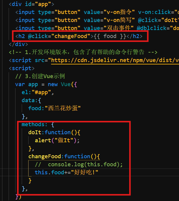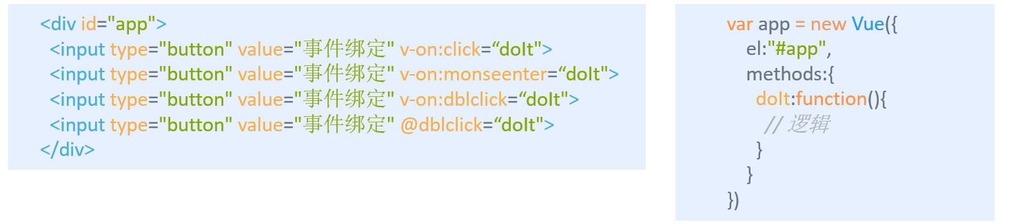 控制按钮被点下后的行为,如果到时候需要绑定多个行为,则可以以@符号代替v-on:。@右边要写事件,例如点击,双次点击,滑动。然后等号右边对应的就是方法名,这个方法名放在Vue对象的method方法内部