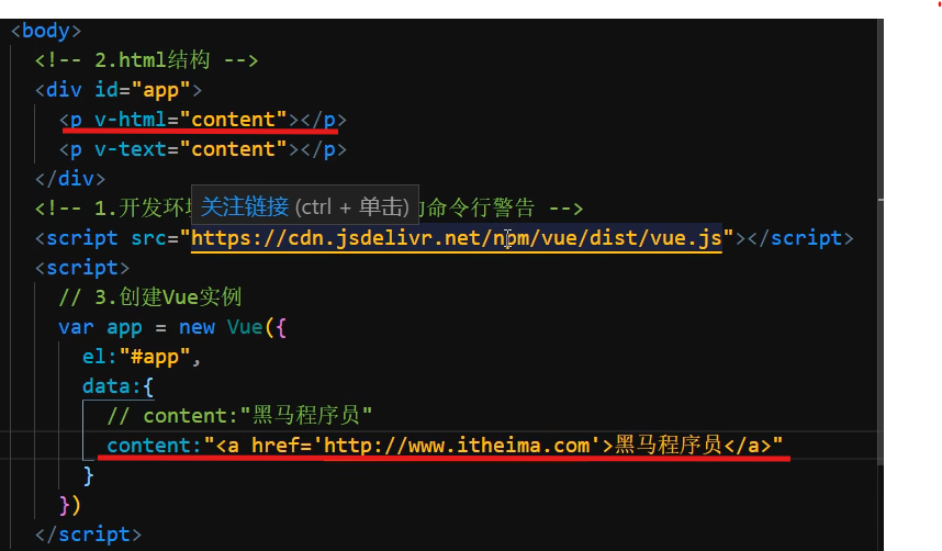 输出单纯的文本,则与v-text没有什么区别,但如果内容里的是html文件里面的特定标签,则会按照那个标签的形式输出,例如:
