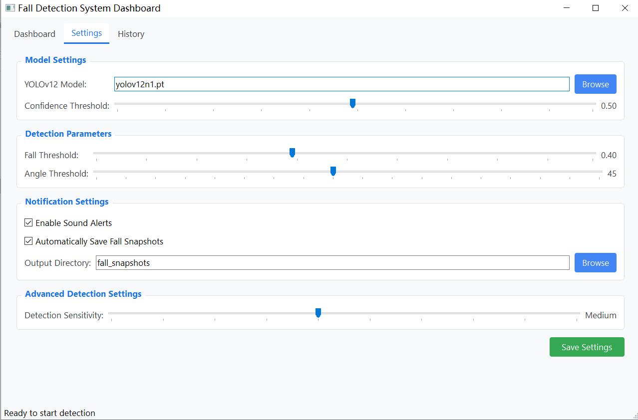 --mode:应用程序模式(dashboard或cli)--model:YOLOv12模型文件路径(默认:yolov12n1.pt)--conf:检测置信度阈值(0-1)--source:视频源(0表示网络摄像头,或视频文件路径)--fall-threshold:跌倒检测灵敏度阈值(0-1)--angle-threshold:身体角度阈值(0-90度)--save-falls:检测到跌倒时保存帧--output-dir:保存跌倒快照的目录