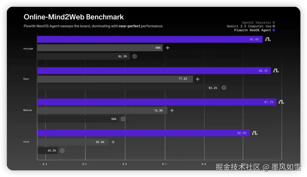 要衡量一个AI产品的真正实力,基准测试数据无疑是最硬核的证据。而FlowithOS在这方面,用"令人惊叹"来形容毫不为过。在权威的Web Agent测试平台Online-Mind2Web上,FlowithOS取得了令人咋舌的成绩:综合平均准确率高达95.4% ,在最高难度级别上,更是以92.8% 的准确率傲视群雄,大幅超越了同期OpenAI发布的ChatGPT Atlas的75.7%,甚至也把Google Gemini 2.5等一众高手甩在身后。