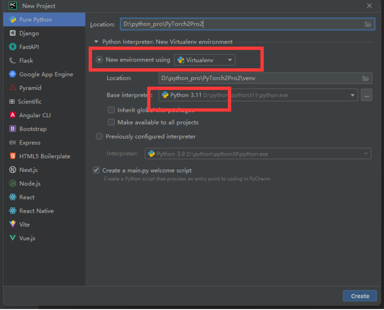 我们安装以Windows操作系统和跑CPU为例讲解。首先新建项目,Python版本用3.11,以及使用虚拟环境创建。