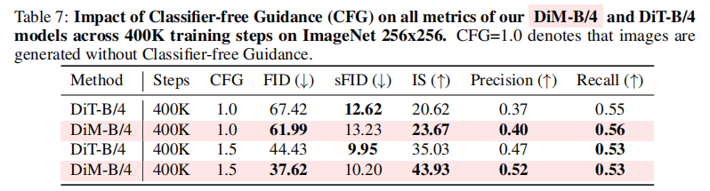 - 且 DiM 在两种 CFG 下均优于 DiT,证明其条件生成能力更稳定。