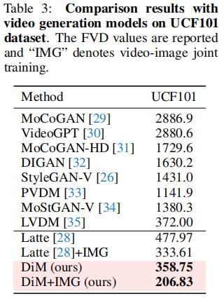 视频生成的核心是 "不能只看单帧质量,还要看帧间连贯性"。论文在 UCF-101 上对比了 DiM 与 10 种主流视频生成模型(如 MoCoGAN、StyleGAN-V、Latte),结果如表 3 所示: