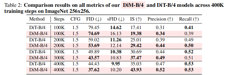 表 2 对比了 DiM-B/4 与 DiT-B/4 在 ImageNet 256×256 上的训练过程(每 100K 步的性能)。可以发现: