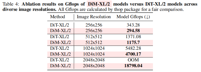 - 效率优势保持:即使是最大的 DiM-XL,其计算量仍比 DiT-XL 低 14%(表 4),证明 DiM 的缩放性不受复杂度制约。