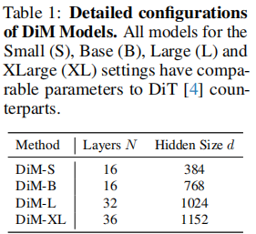 为了与 DiT 公平对比,论文设计了 4 种尺寸的 DiM 模型,参数规模与 DiT 对应版本一致(见表 1):