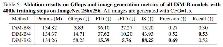 表 5 中对比了 DiM-B 在不同 patch 尺寸(8、4、2)下的性能。结果显示: