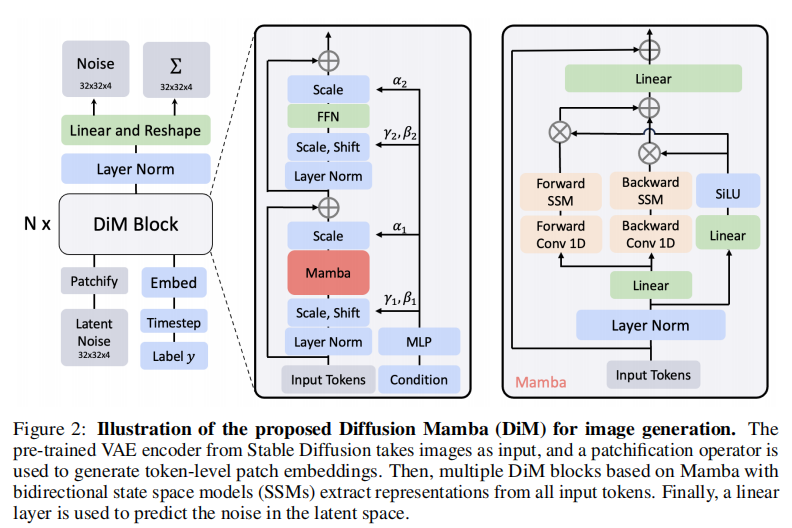 注:图 2 展示了 DiM 的端到端流程,从 VAE 编码到 DiM Block 处理再到噪声预测,红色框标注的 DiM Block 是核心模块。