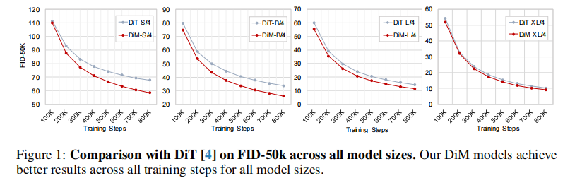 图 1 对比了不同规模 DiM(S/4、B/4、L/4、XL/4)与 DiT 在 FID-50K 上的性能。结果显示: