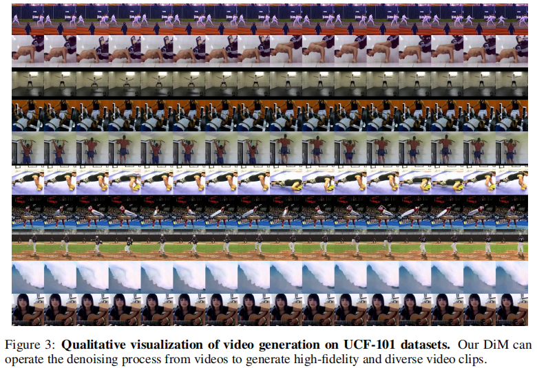 - 定性结果(图 3,见前文)显示,DiM 生成的视频(如 "打篮球""骑自行车")无帧间模糊,动作连贯,细节清晰(如球员的球衣纹理、自行车轮的辐条)。