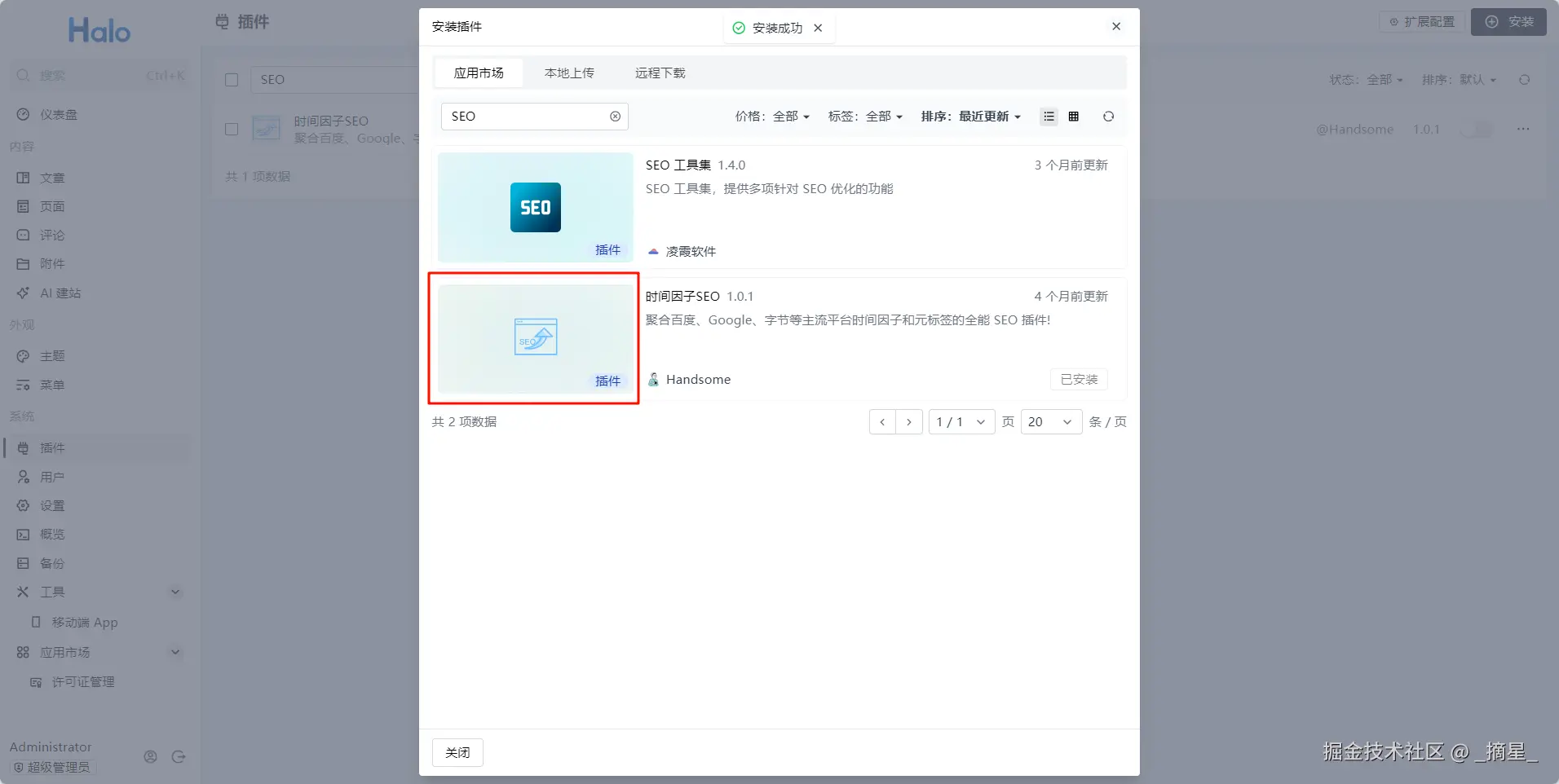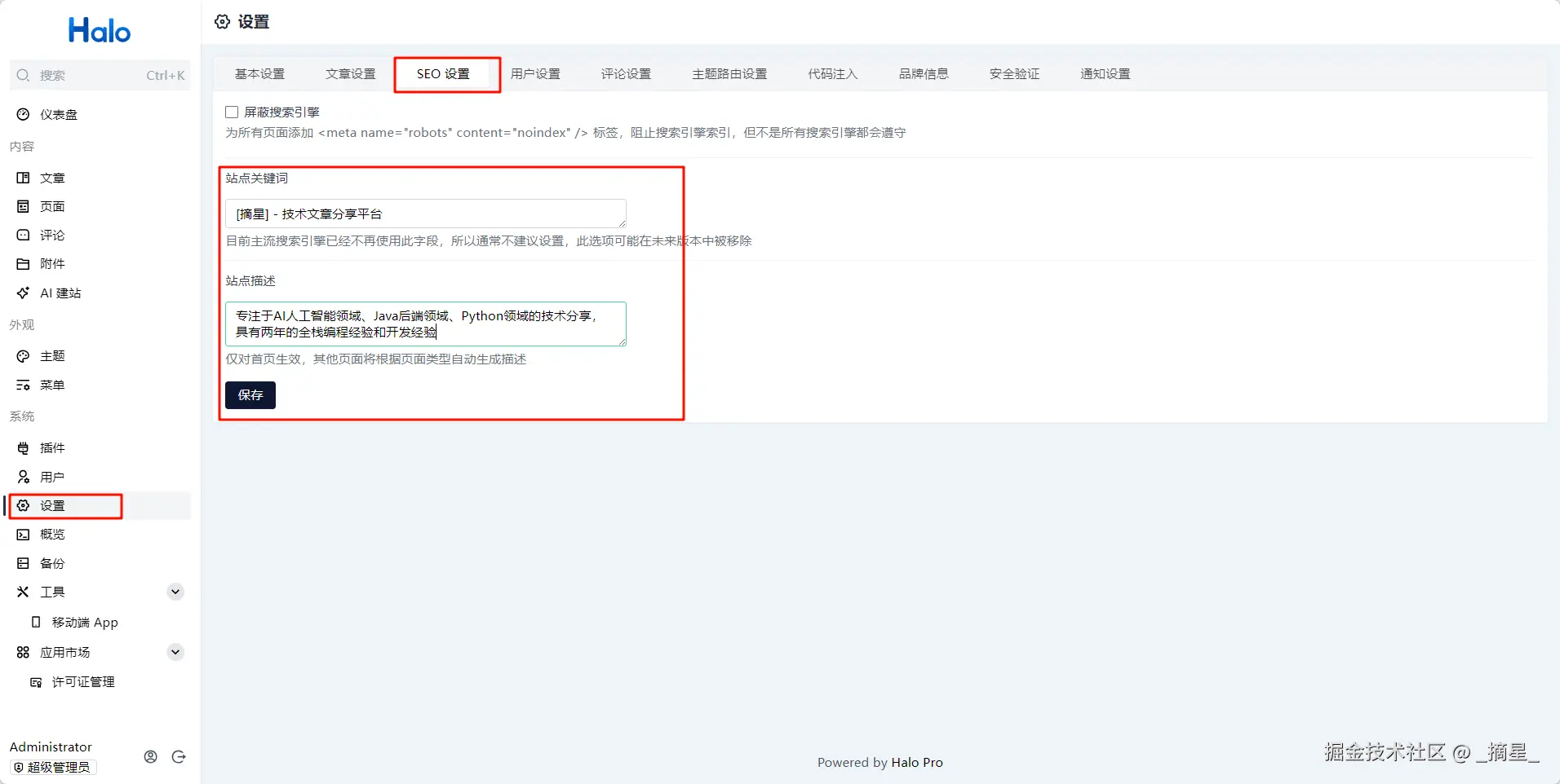 为了让博客真正被搜索引擎发现,我不仅配置了精准的站点标题、描述和关键词(如"云原生""开发经验""技术分享"),还安装了 Halo 的 SEO 插件以增强元数据控制。此外,我还探索了几个高阶集成: