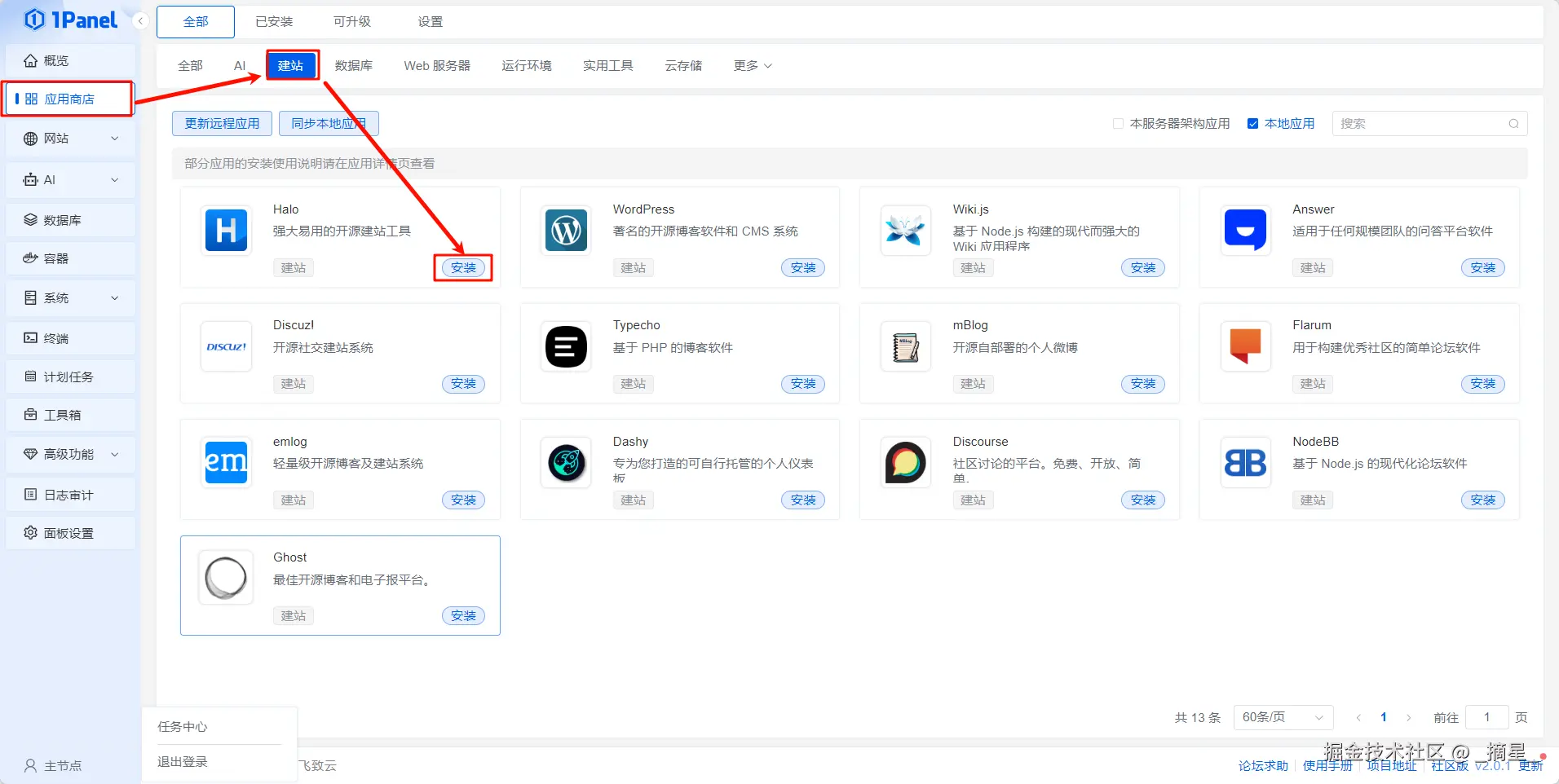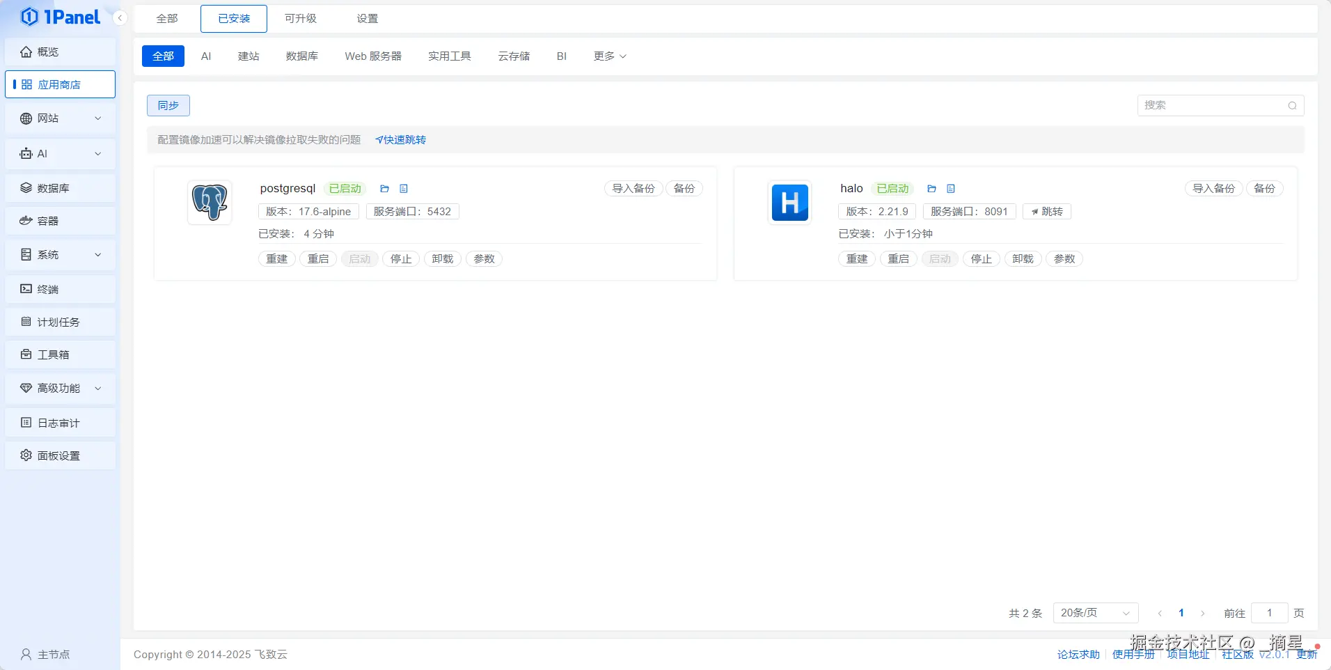 | 应用商店 | 一键安装主流应用(如 Halo、WordPress、MySQL、Redis 等),支持版本管理、启停、配置修改与卸载 |