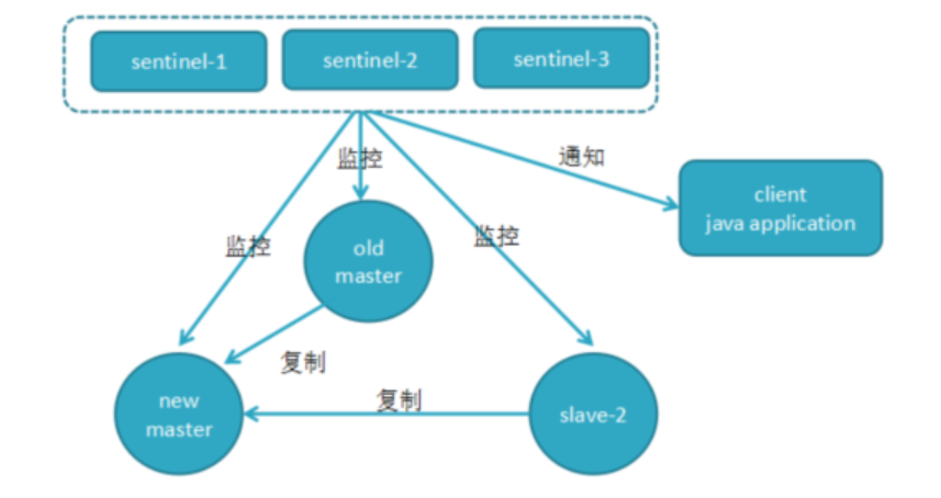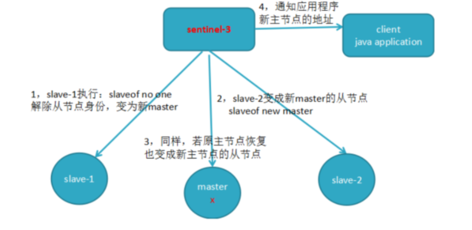 3. Sentinel节点集合会将原来的主节点更新为从节点并保持对其关注,当其恢复后命令它去复制新的主节点。