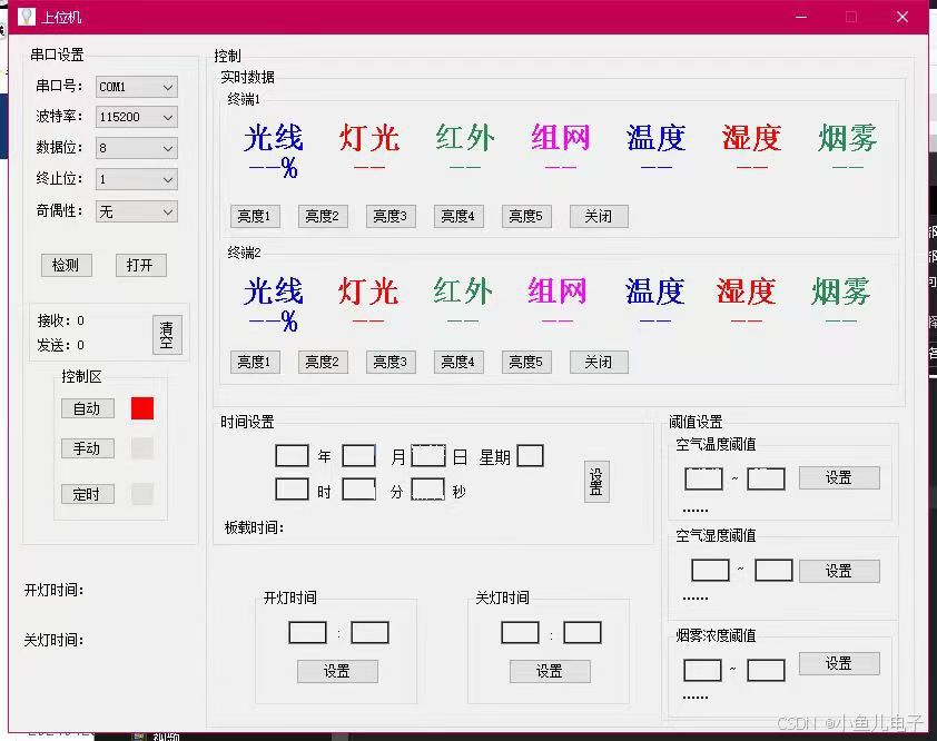 - 电脑上位机管理:通过串口通信技术将监测数据上传至电脑上位机,管理人员可以通过电脑上位机进行数据查看、阈值设定和模式及照明亮度等级控制,可以帮助管理人员更好的管理公共照明路灯。
