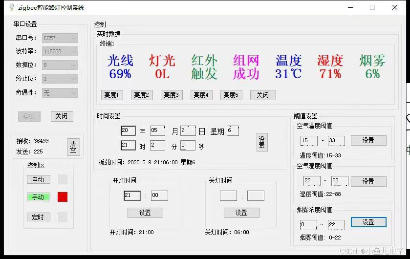 通过串口通信与中间层的 ZigBee 协调节点交互,是系统的 "中枢管理端",管理人员可在此查看所有路灯的状态、下发控制指令。