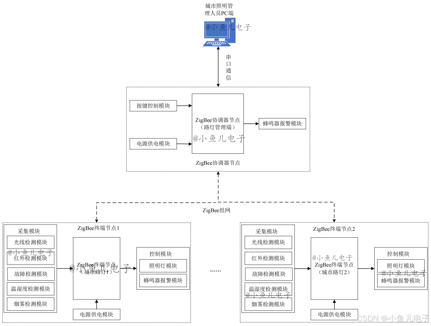 每个路灯对应一个终端节点(如 "ZigBee 终端节点 1""ZigBee 终端节点 2"......),是系统的 "感知与执行单元",包含两类核心模块: