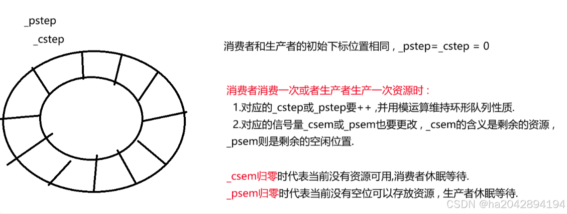 vector<T> _ringQueue:消费者和生产者都可以访问的交易市场(共享资源).int _cap: 人为规定的共享资源的最大容量 .Sem _csem: 消费者的信号量 , 记录剩下多少可使用资源.Sem _psem: 生产者的信号量 , 记录剩下多少空闲位置.int _cstep: 消费者的消费位置 , 即向vector里添加元素时的下标.int _pstep: 生产者的生产位置 , 即向vector里获取元素时的下标.