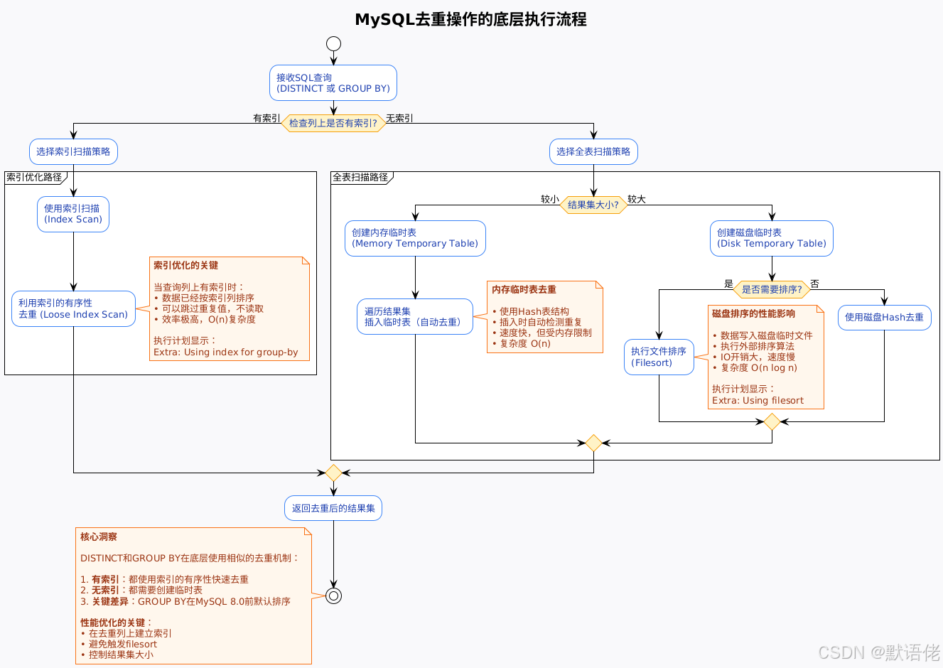 关键发现:在有索引的情况下,DISTINCT和GROUP BY使用完全相同的执行计划!MySQL优化器将DISTINCT内部转换为GROUP BY执行。