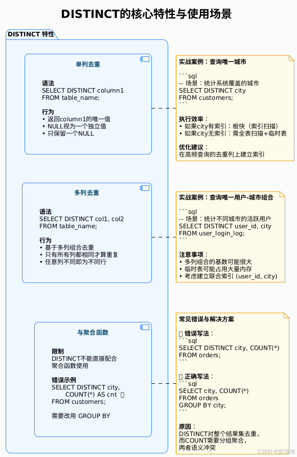 DISTINCT是SQL标准中的去重关键字,语义清晰,用法简单。让我们深入理解它的特性: