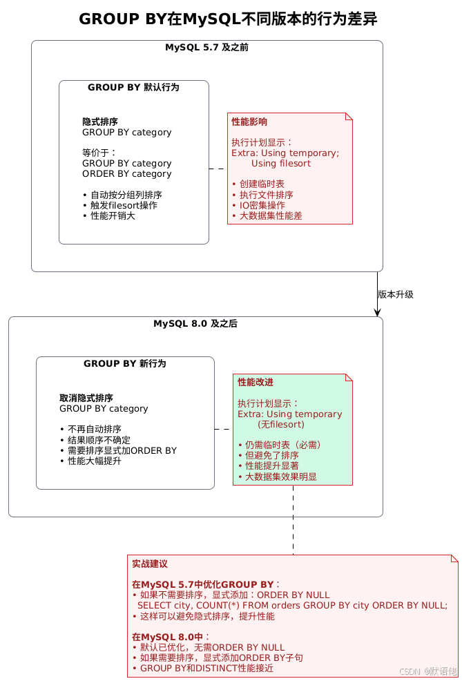 关键发现:在MySQL 5.7及之前版本,GROUP BY会触发额外的排序操作,这是性能差异的根源。